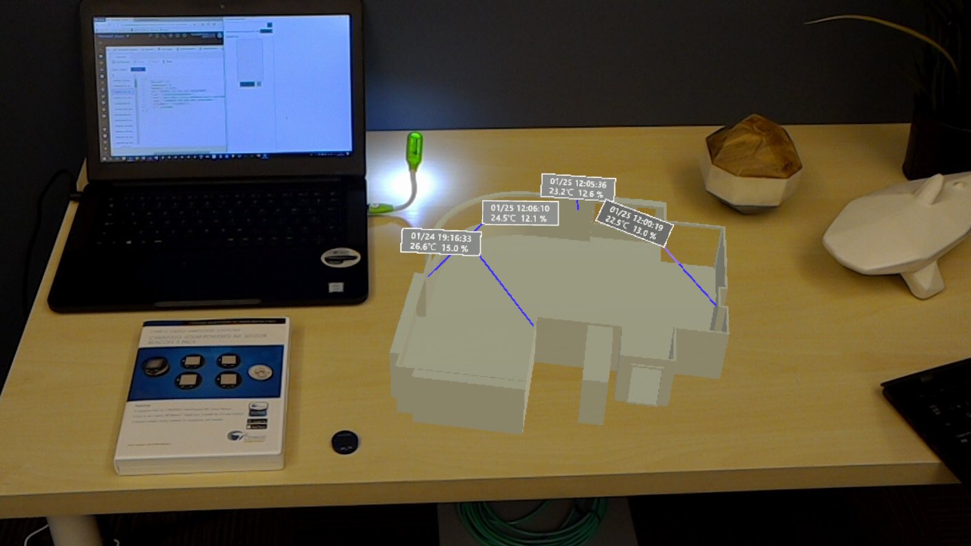ホロラボ事務所に取り付けた温湿度センサーの値をAzureに溜めて、実際の部屋の形状にマッピングして見るデモです。ひとつは現地にもおいてあり、それはHoloLensが直にデータを取得しています。