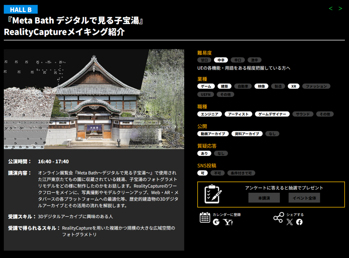 - セッション詳細ページ:『Meta Bath デジタルで見る子宝湯』RealityCaptureメイキング紹介 | UNREAL FEST 2024 TOKYO 公式Webサイト
